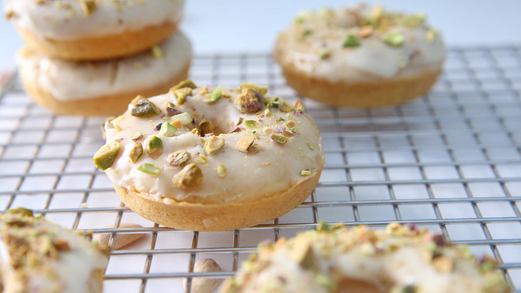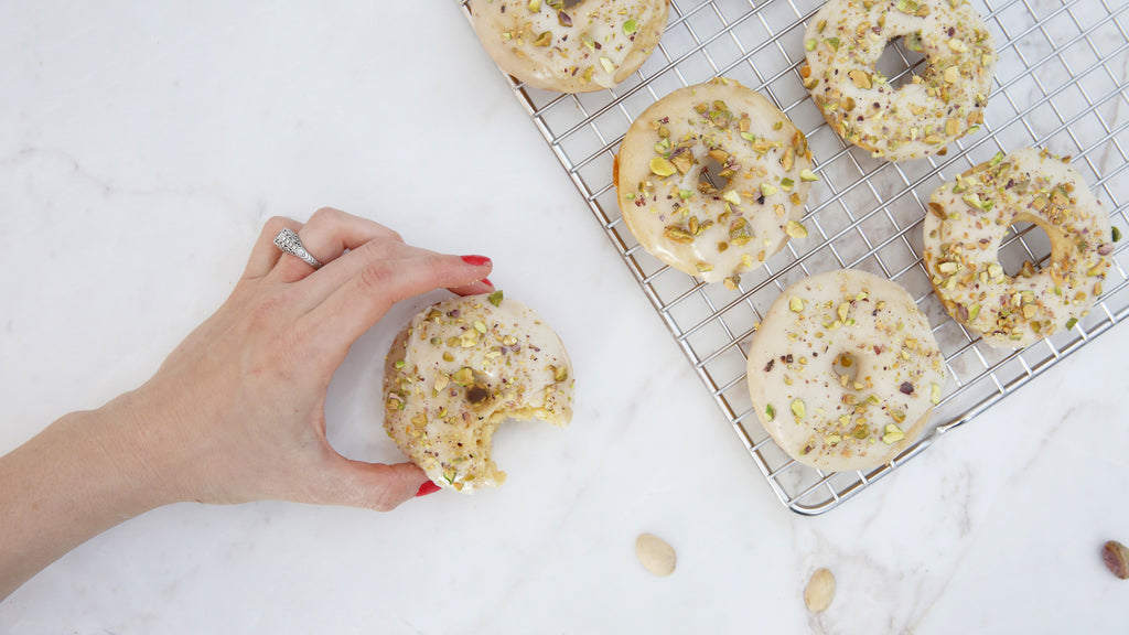 To make the glaze, in a medium bowl whisk together the remaining brown butter, one tablespoon of milk and the dry glaze mix. Stir until the mixture becomes smooth then use a butter knife to spread the glaze onto the top of each donut. Sprinkle chopped pistachios onto the glaze.