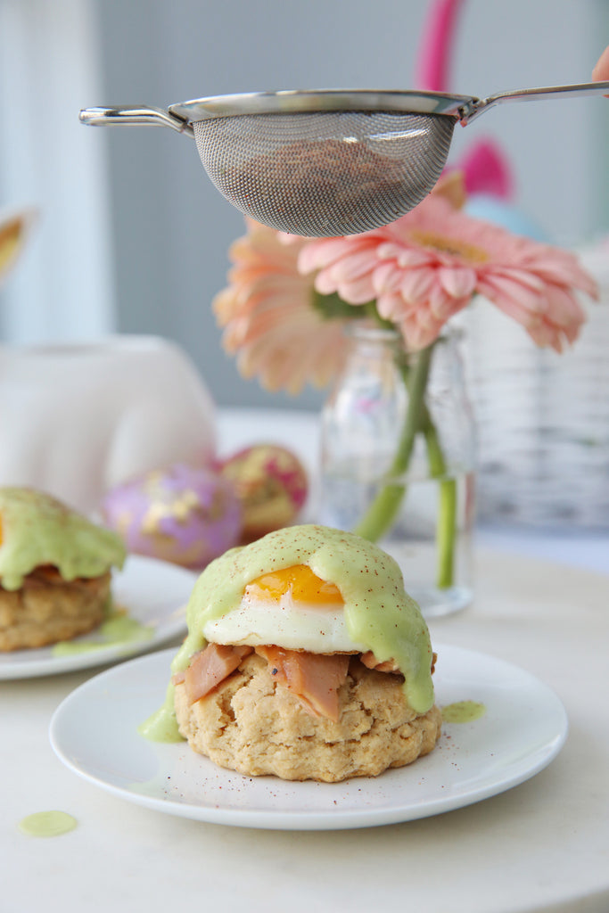 Top the biscuits with the smoked salmon and an over easy egg. Drizzle avocado sauce over the top of each egg, then garnish with a sprinkle of paprika.