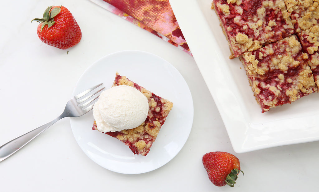 Pour the strawberry mixture over the bottom dough layer in the baking dish. Sprinkle the remaining 1/3 crumb mixture evenly over the top. Bake 45-50 minutes until the top is golden brown and crisp.