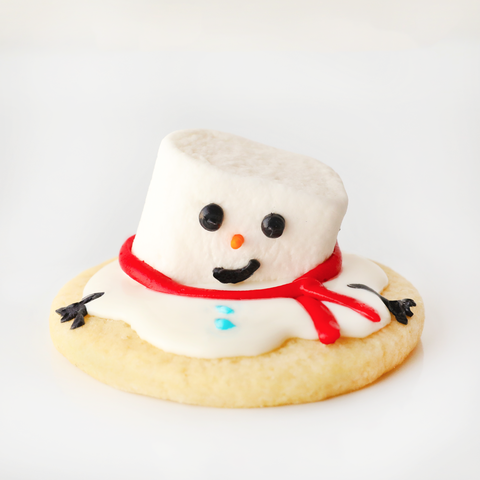 1. Take a cookie and pour on some of the White Frosting on the middle of the cookie in a "melted" design. Put a Marshmallow half in the center of the cookie and put one India Tree Orange Sprinkle into the center. Next, use the Black Frosting to pipe on eyes and a smile.