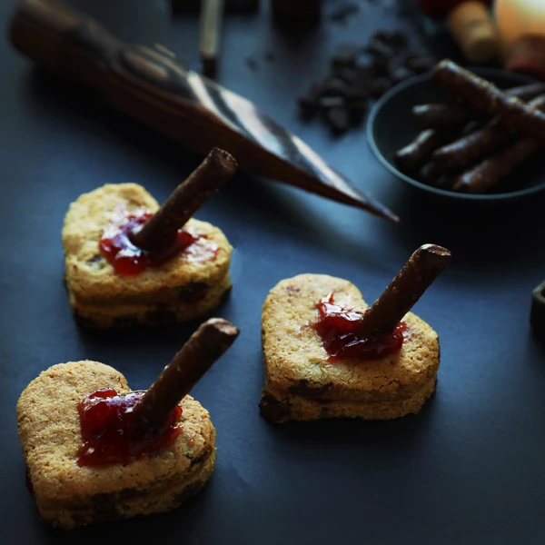 Repeat with remaining cookies. Place one pretzel rod into the center of each cookie, then place a second teaspoon of jam around the base of the pretzel rod. Serve immediately!