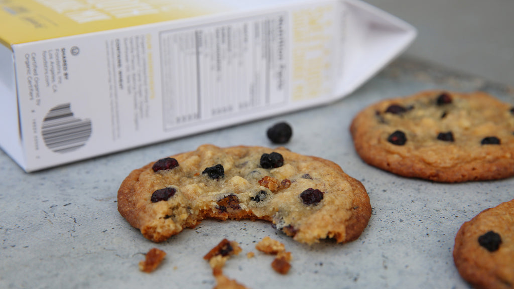 With the mixer speed on low, add the sugar cookie mix and baking soda and blend just until the dough comes together, about a minute. Scrape the sides of the bowl and add the milk crumb mixture and the dried blueberries into the dough, blend on low speed until incorporated, about a minute.